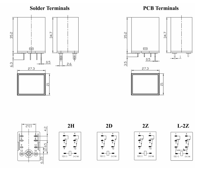 연락처 양식 : 2Z (DPDT), 3Z (TPDT), 4Z (4PDT), 2H (DPST-NO), 3H (TPST-NO), 4H (4PST-NO) 및 2D (DPST-NC)와 같은 구성이 포함됩니다. 이러한 형태는 스위칭 요구 사항이 다르며 미니어처 릴레이의 다양한 사용에 적합합니다.